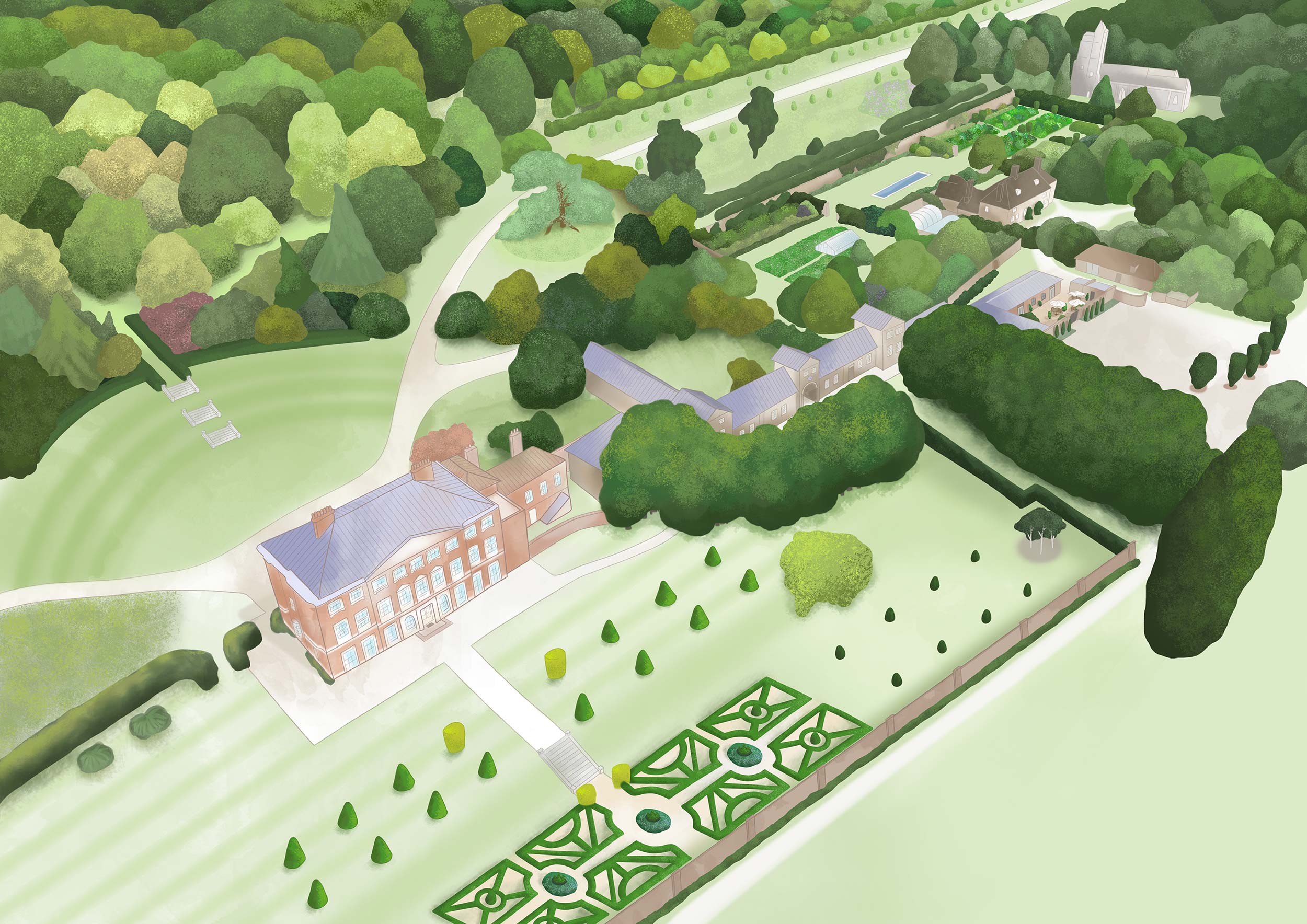 With its Queen Anne facade, the eastern side of the house overlooks a wide expanse of lawn bisected by a central gravel path. The stone steps descend to a lower terrace and a box parterre planted to celebrate the Millennium. Avenues of yews, cut into conical shapes, run along both terraces. The formal character of this part of the garden compliments the architecture of the house and allows for clear views of the estate beyond.